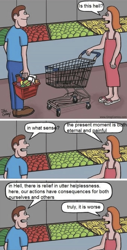 Man: In hell, there is relief in our utter helplessness. Here, our actions have consequences for both ourselves and others.